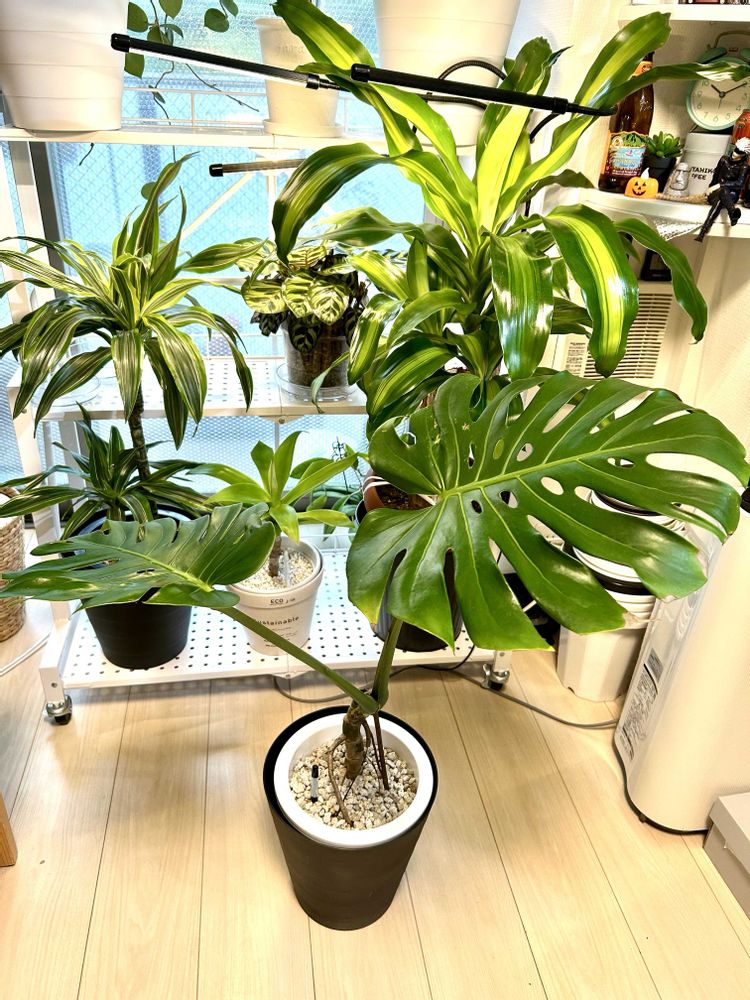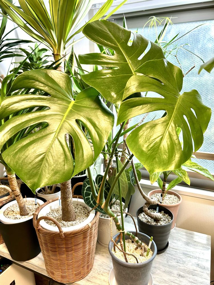 💦水やり😊モンステラ3姉妹😊初号機はもう2年になります😊タイコンさんは新芽が開いたらセミハイドロポニックスにしようかと思ってます😊初号機は3つに株分して2つは華友さんにあげましたがやはりモンステラは魅力的で大好きでその後2つお迎えしました😊