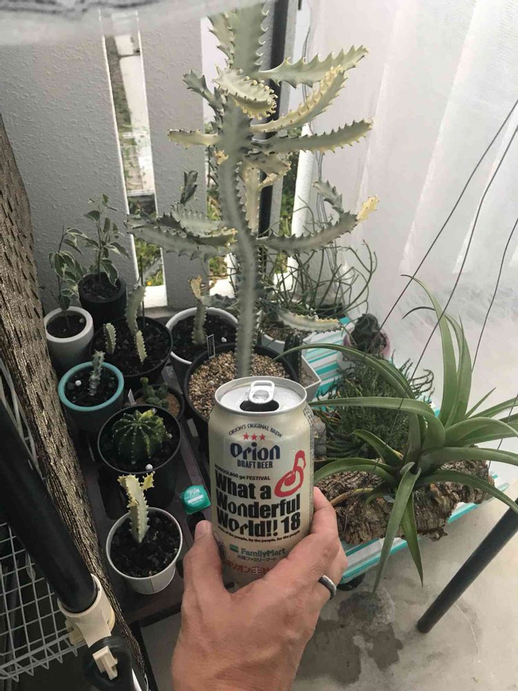 今日は、モンパチコラボのオリオンビールを飲みながら、ベランダで植物チェックです。