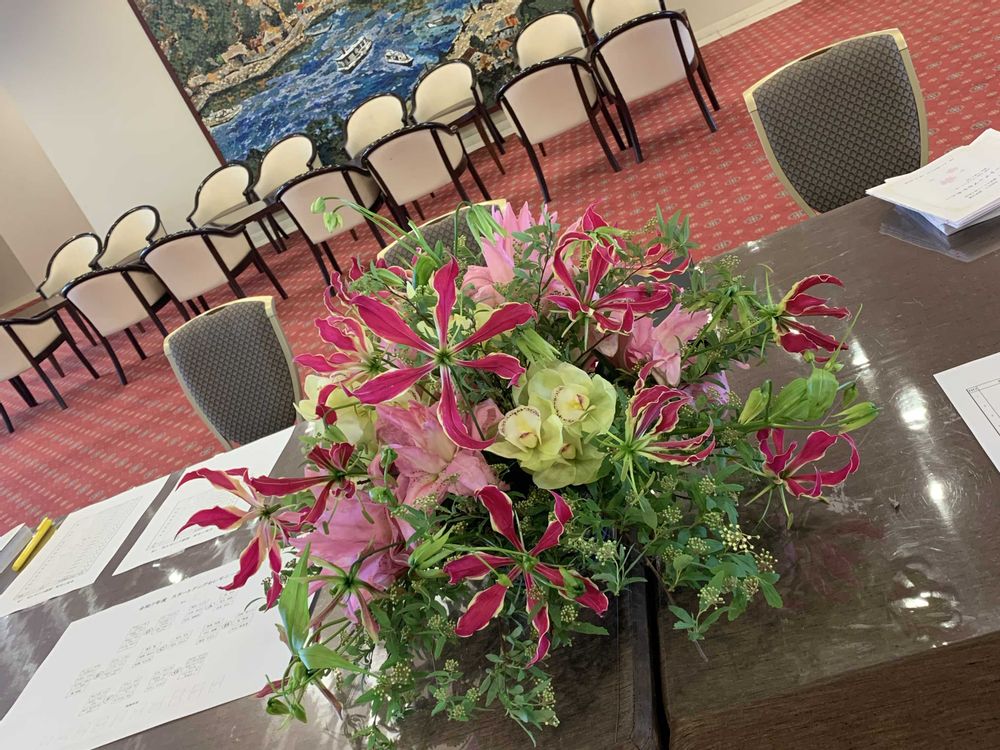 新学期を始めるおめでたいセレモニーの会場を花一杯飾りました。