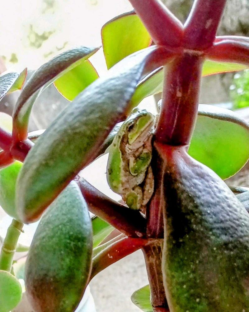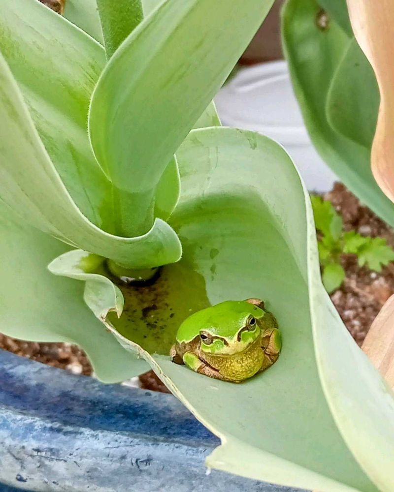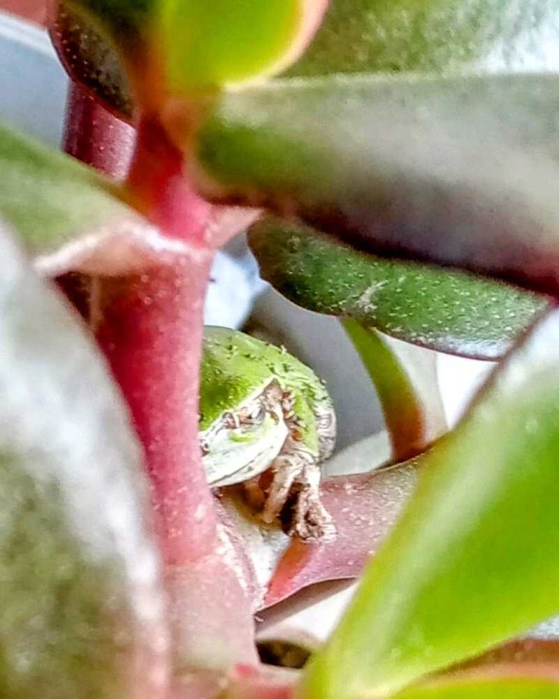 さん🐸🎵こんにちは😊今日は雨でお茶摘みも出来ず、カエルちゃん🐸探し頑張ってました🤣🤣🤣金のなる木の横には、じいちゃんの寝室あるんよ🤭この子が夜中激しくケロケロやるらしいんだよね😂✌️なかなかうるさいらしい🤭なはは😅💦