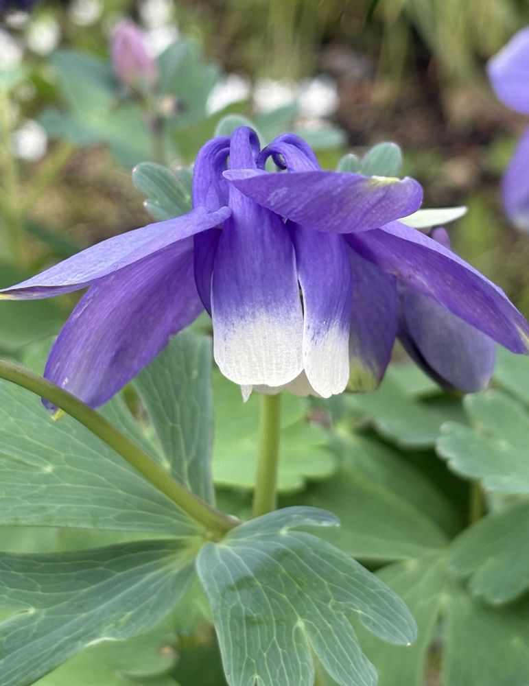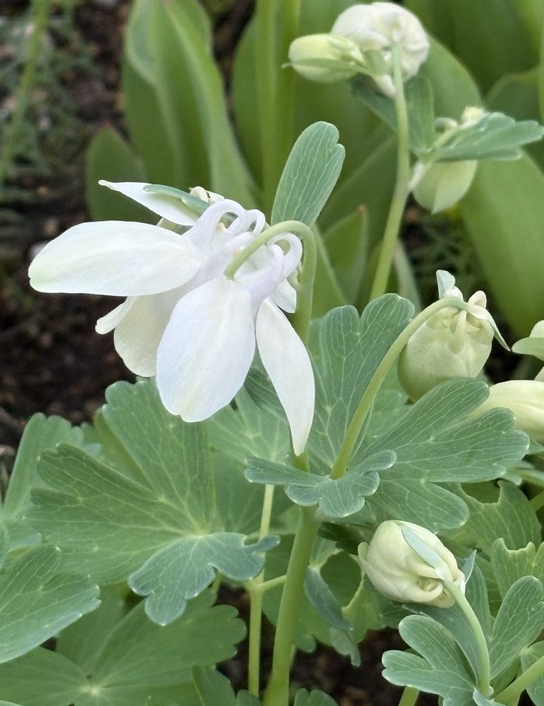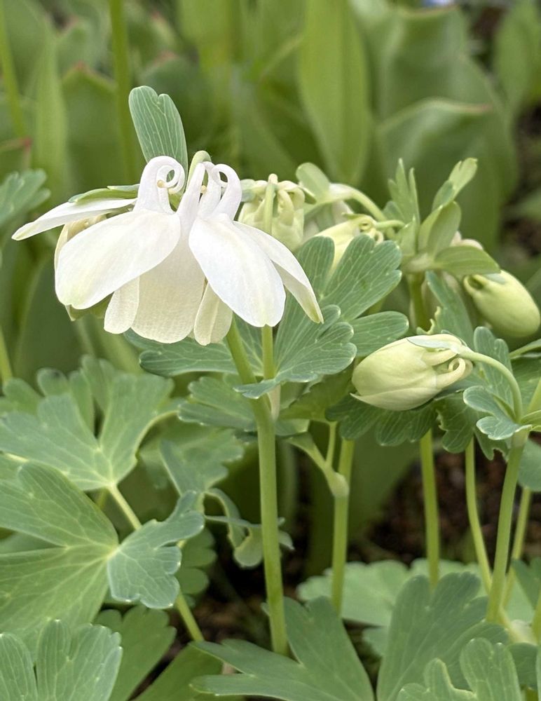白のオダマキ珍しいです。山では、よく見かけるけど、白には会えません。下を見た花、恥じらいかなー