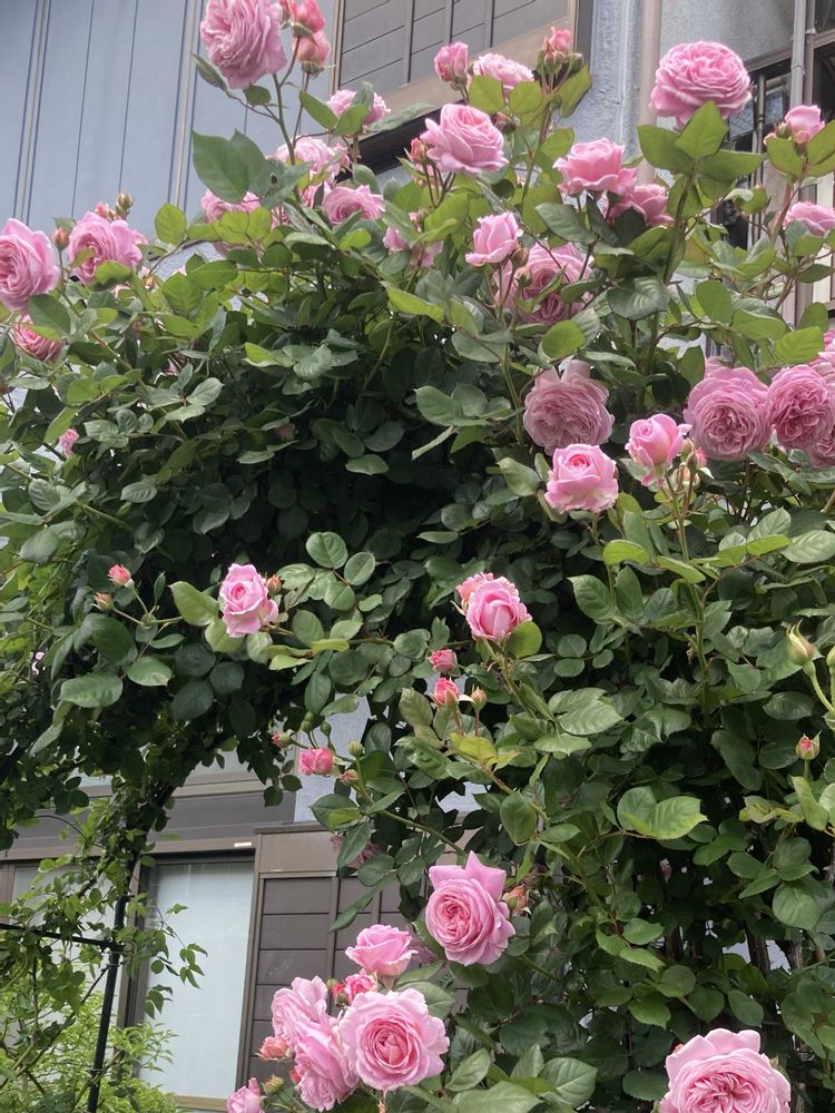 一枝に数個の蕾があって大きな花を付けるマリーヘンリエッテは次の花の為に✂️しますが、🪜を出す作業が怖くなってきました。