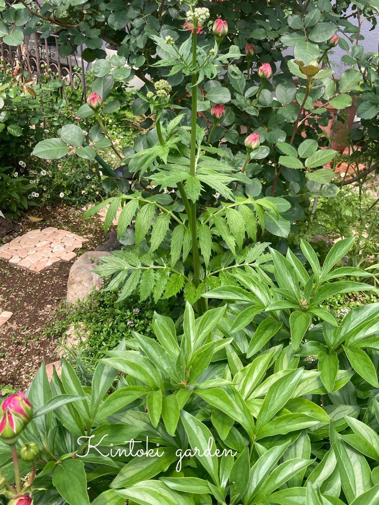 芍薬と昨年お迎えのカノコソウその背後はバラ アシュリーです。