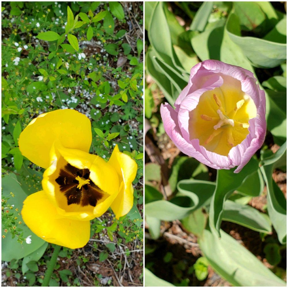 黄色/黒とピンク/黄色のチューリップは毎年遅咲きさん。
