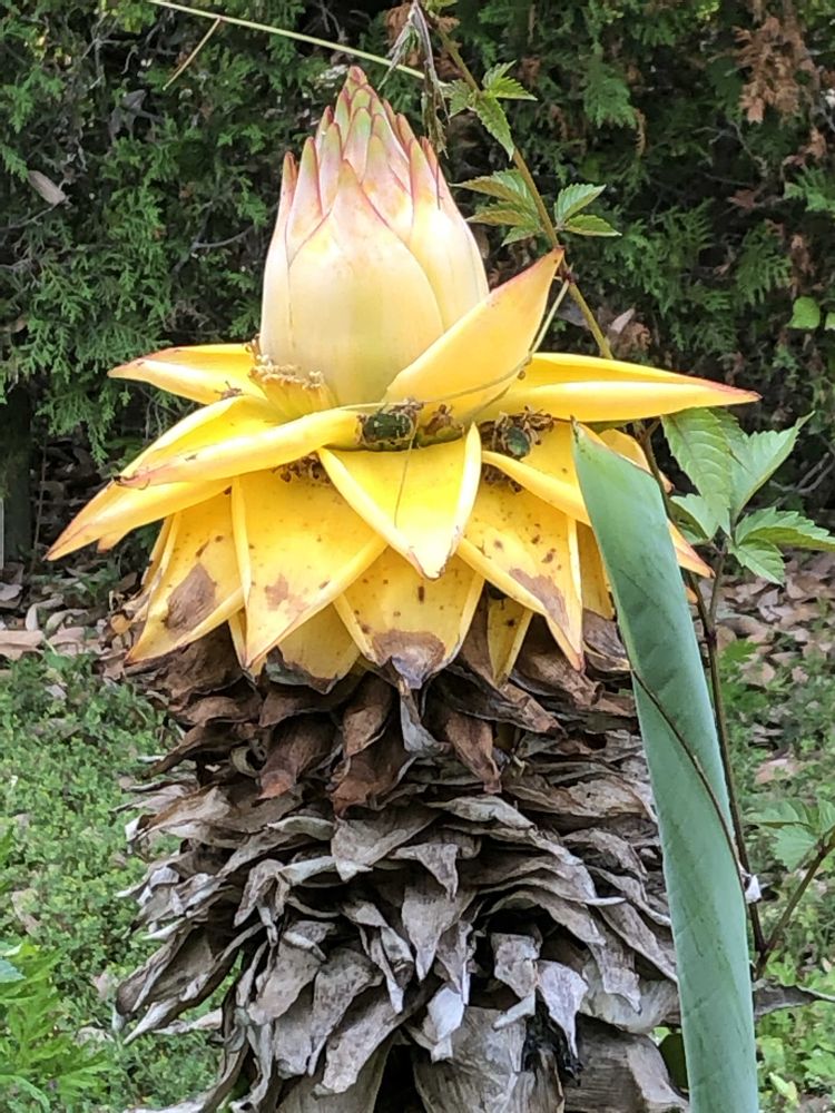 @太陽の塔 さん、何やらコガネムシが花粉を食べて?いますね!近くに別の株があれば受粉して小さなバナナのような実ができるかも?我が家の近くの民家にも今咲いています。
