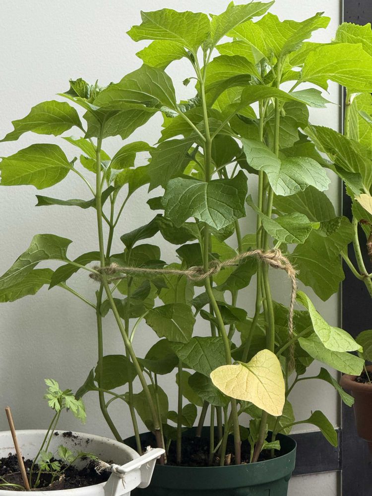 昨年勝手に生えてきたホオヅキ風の草。冬に枯れて地下茎だけだったのが暖かくなってきたら急に伸び出した。ホオヅキっぽい。