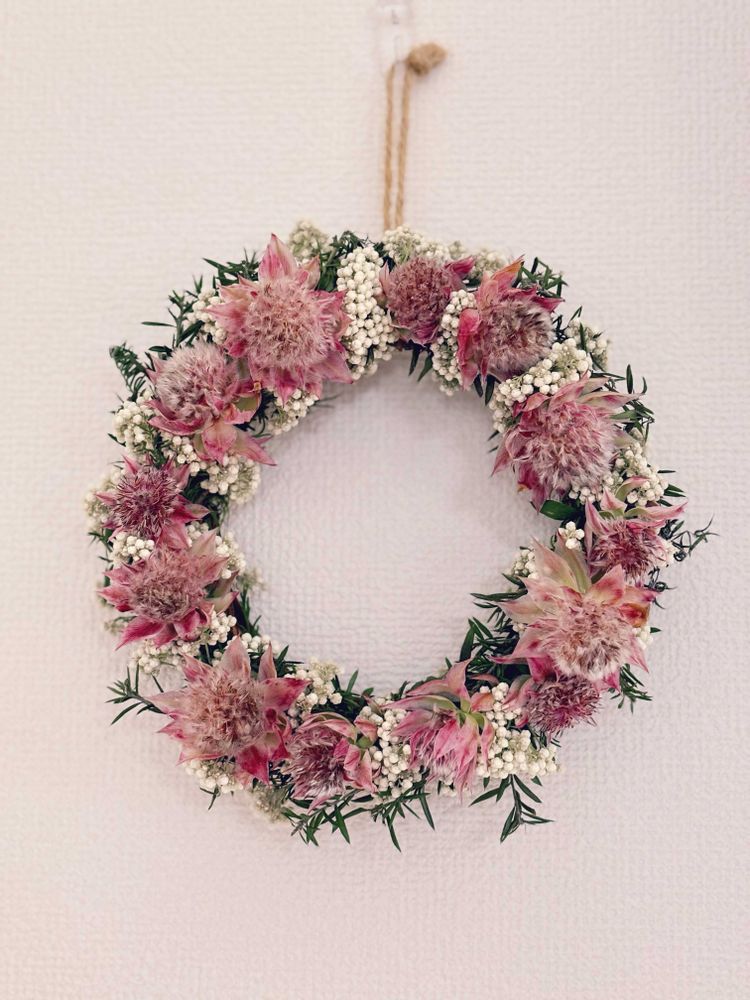いちごのショートケーキのような、かわいらしい雰囲気のリースになりました♡