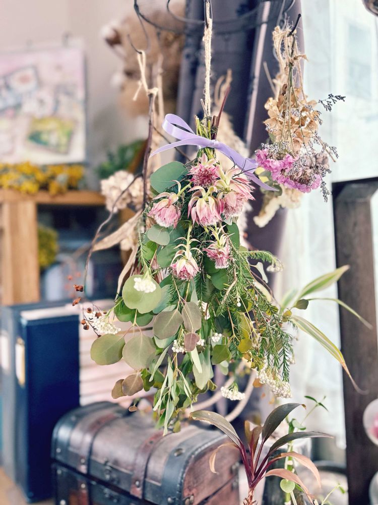 あまった花材はまたいつか使えるように、ユーカリ・ポポラスと一緒にまとめてスワッグに。