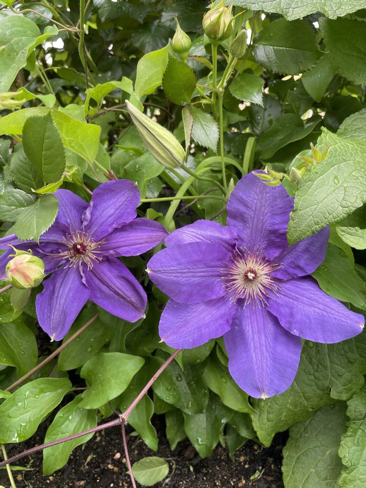 大きく開くクレマチスは2種類あるけど、ピエールドゥロンサールの下に咲いてやっと開いてくれました💜