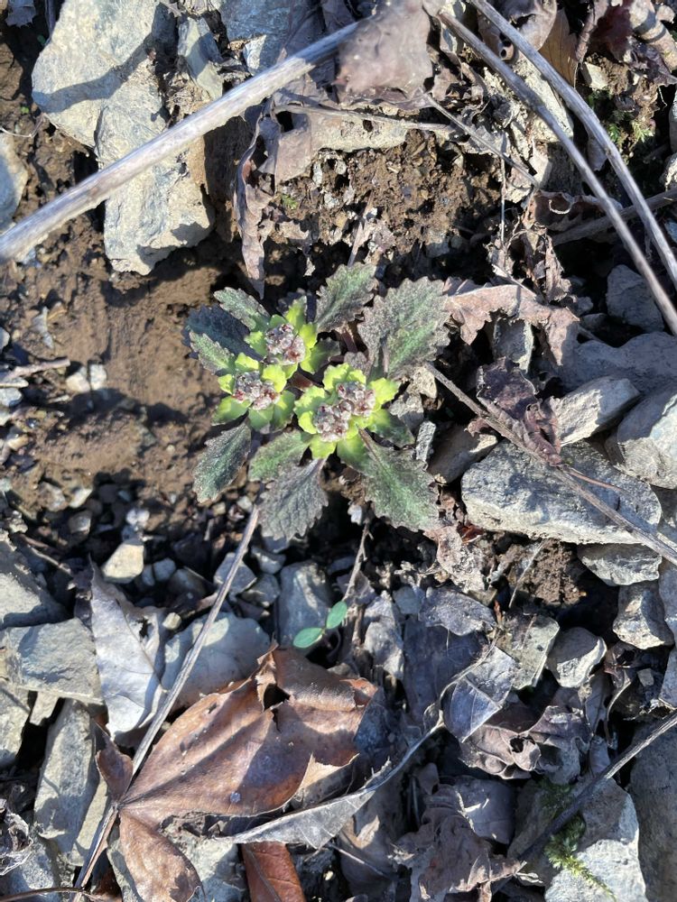 花序の下の苞の黄色と茎葉のごげ茶色🟤から濃い深緑のコントラストが強いため、すぐに見つけることができると思っていましたが、意外にも落ち葉に同化して、見つけるのに難渋しました。