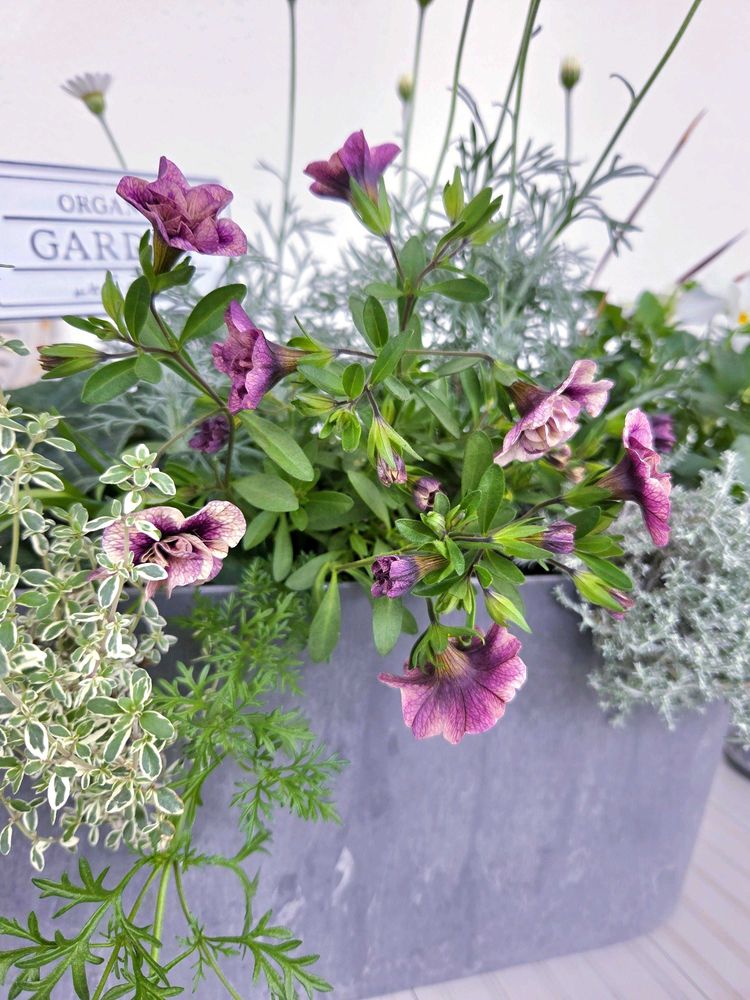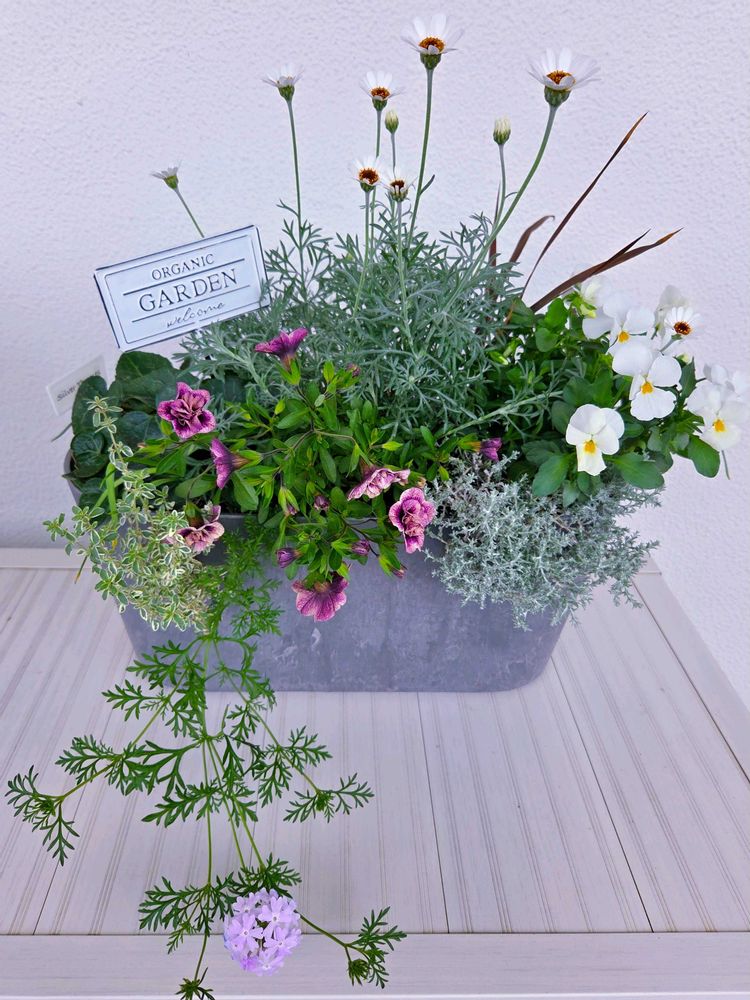 白い寄せ植えに、コルジリネの新芽を植え混んだついでに、同色のペチュニアを植え込みました。溢れ咲く日が楽しみです。
