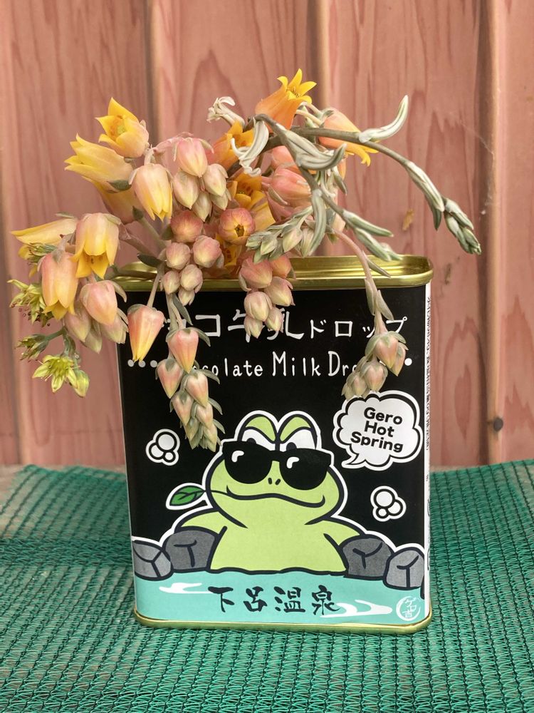 りなははさんからの下呂のお土産のドロップの缶缶にカットした多肉のお花を入れました。