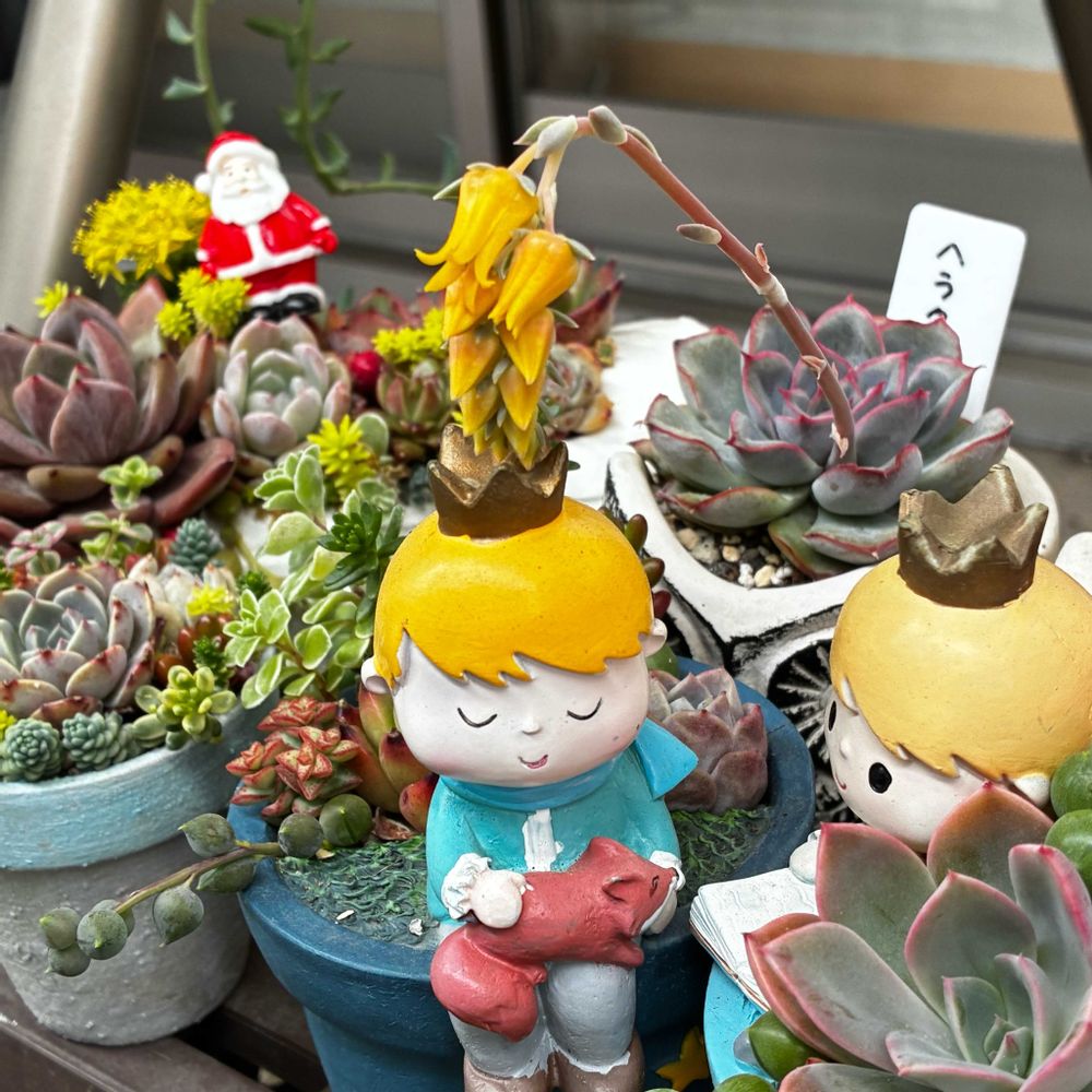 DAISOで買ったヘラクレスに花が咲きました。星の王子様の王冠を直撃するように咲いていて、思わず笑ってしまいました。動かしたわけではなく、何故か斜めに伸びて咲いた先が王冠の上。しかも色も合っているなぁ😆