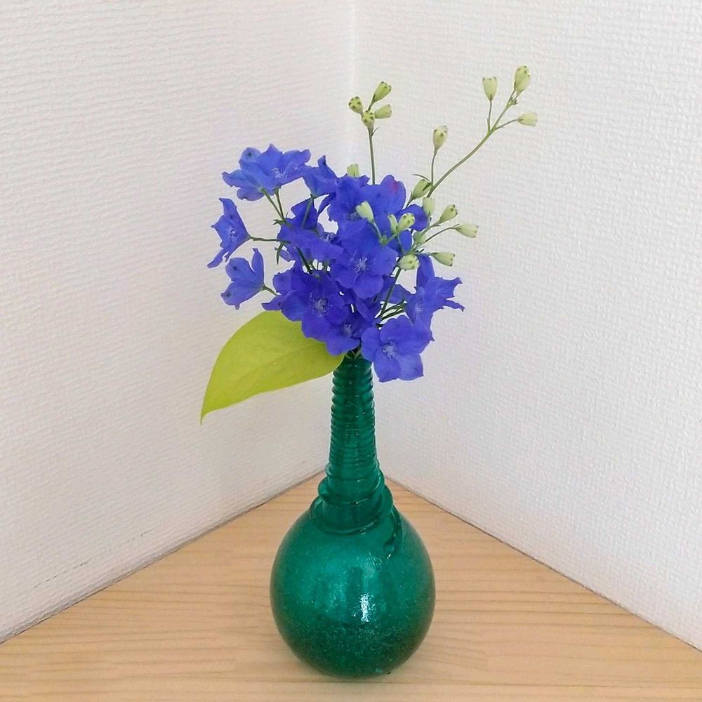お気に入りのガラスの花器に、デルフィニウムをマッス(塊) でいれてみました。