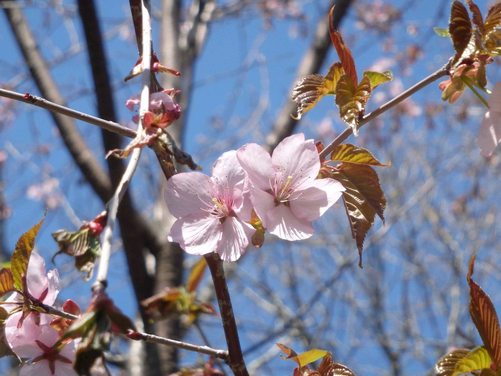ソメイヨシノなどと違い、花と同時に葉っぱが出ますが、赤みのある新葉の色も素敵です💗