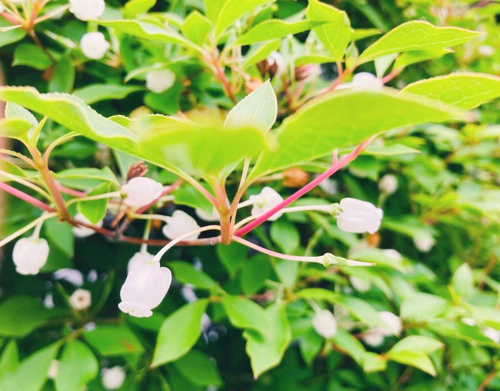 赤い茎の先に、コロンと可愛いらしい白い壺型の小さな花をつける「灯台躑躅(ドウダンツツジ)」で、おはようございます🌿🤍🕊️✨