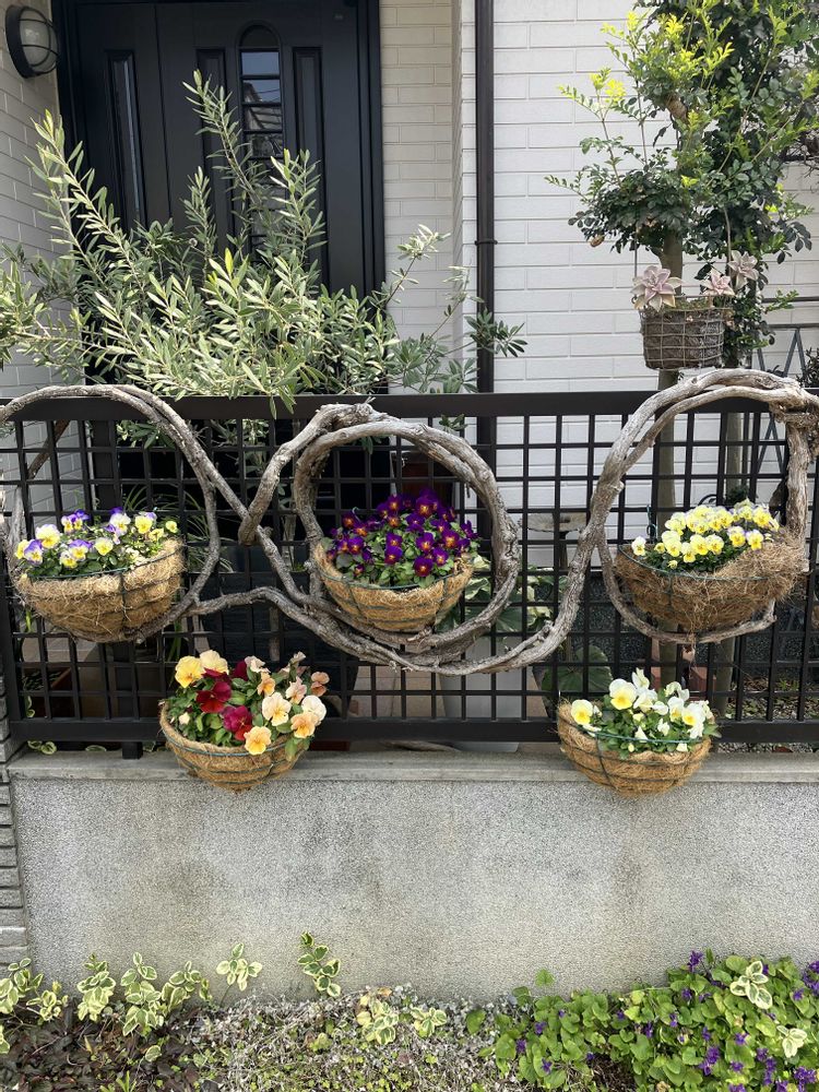 近くのお家の前に、素敵な手作りのハンギングにビオラが、色とりどりに咲いていました🌸🌼