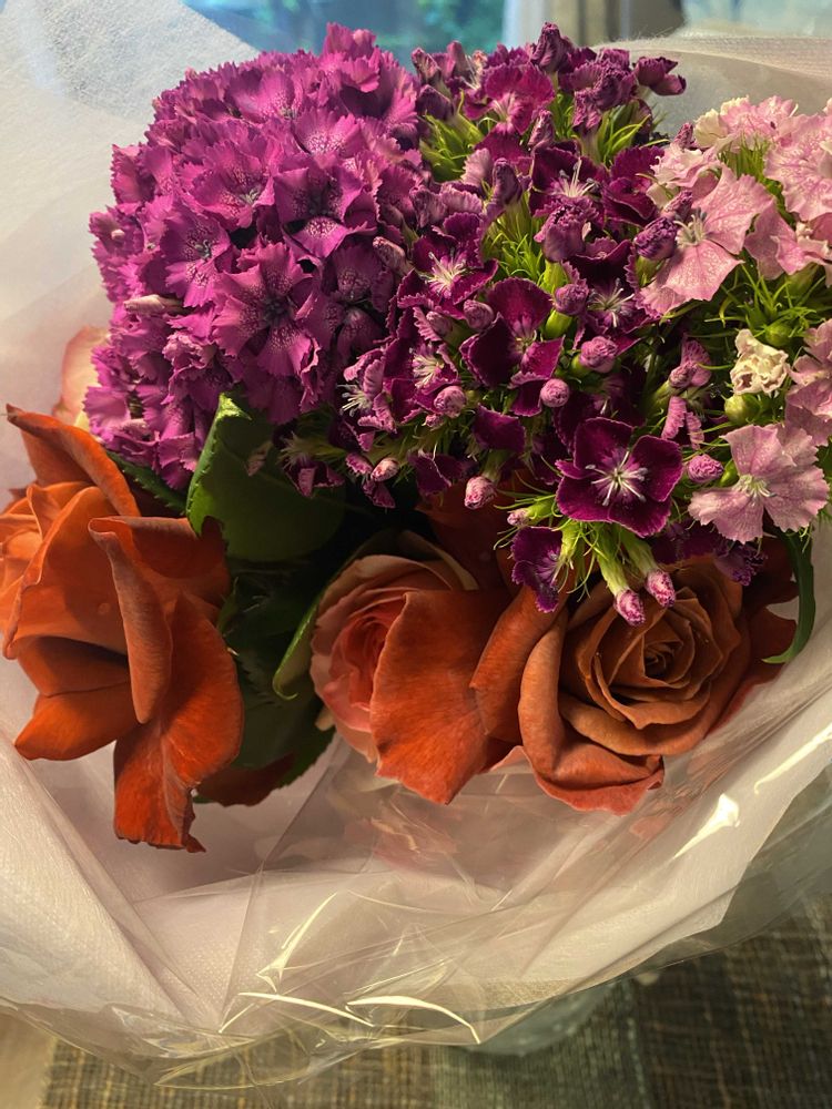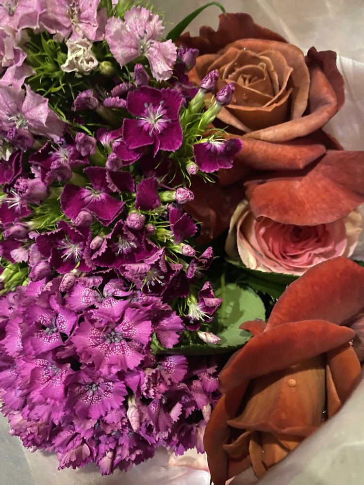 ベランダに咲いた薔薇と撫子で、花束💐を作りました♪🎶💗