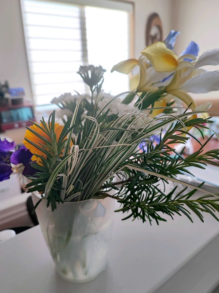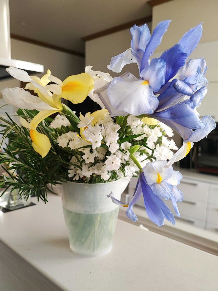 仏壇用の花をカットしてきました。冬から育ててた値下げ苗の切り花用ナデシコがとっても大きくなって、キレイに咲いてくれたので半分くらい収穫しました。あと倒れて育っちゃったアイリスとか。グリーンはローズマリーと超お気に入り、イネ科のリボングラス。