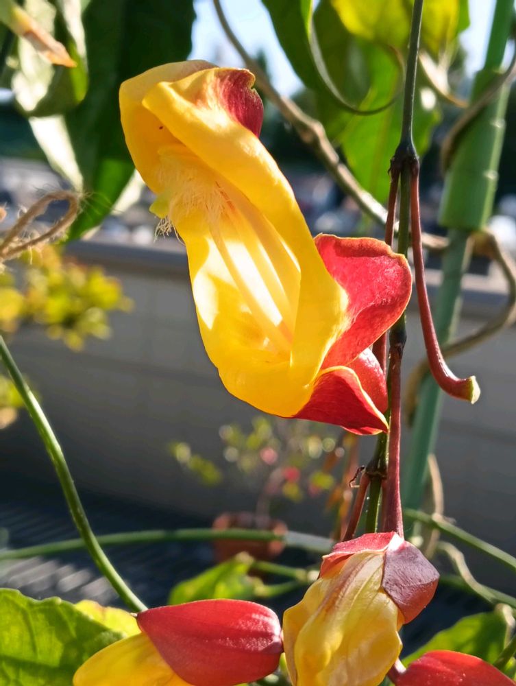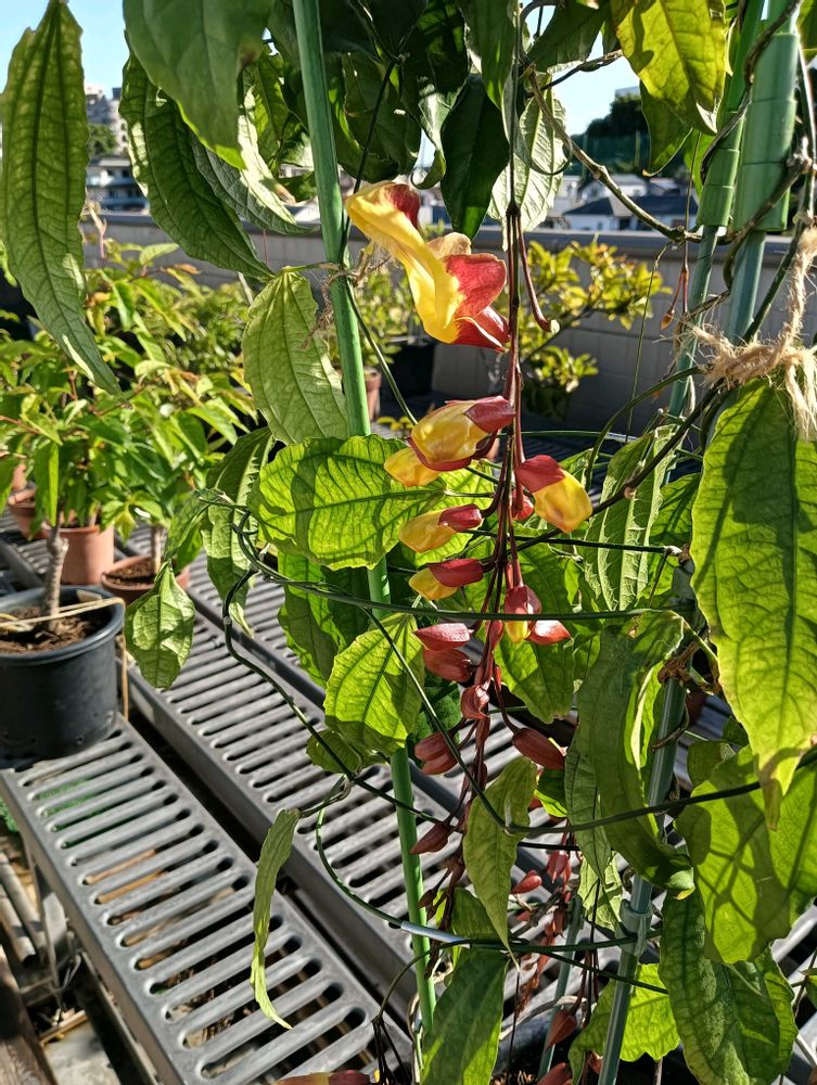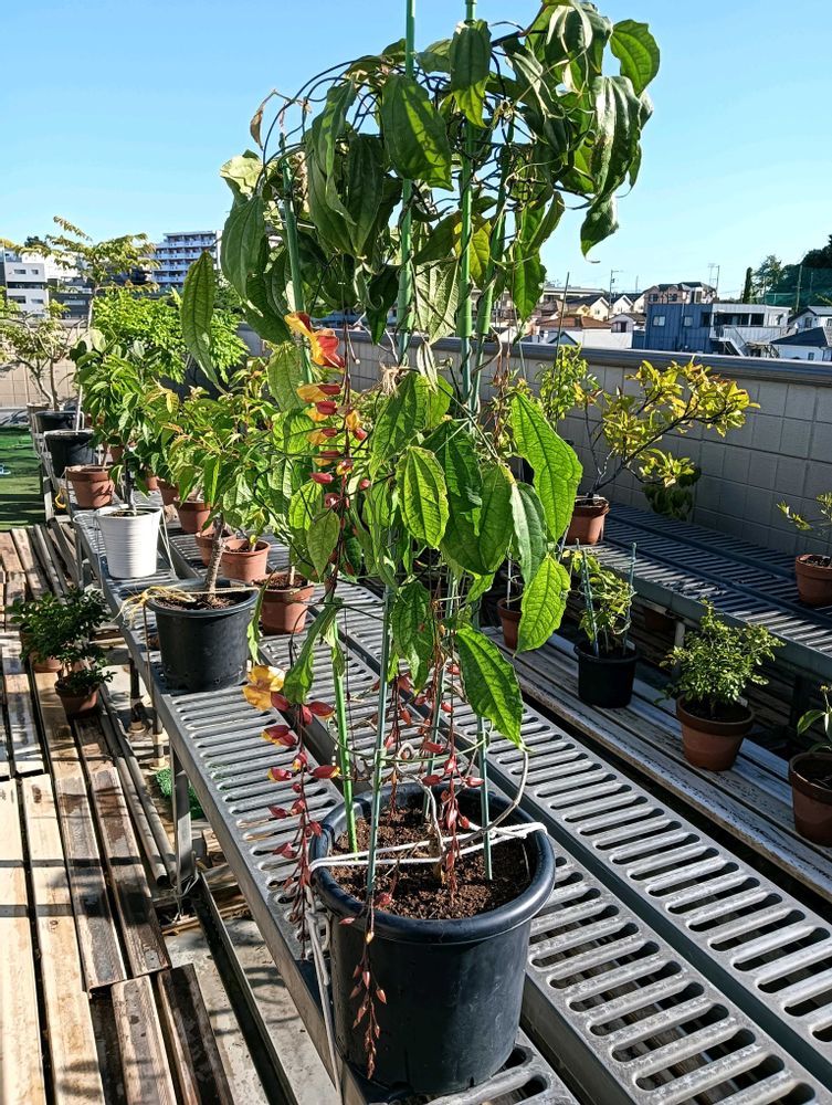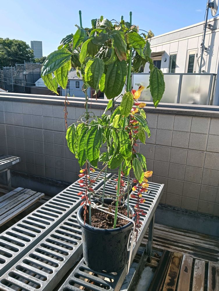 マイソルヤハズカズラ(ツンベルギア.マイソレンシス)が咲き始めました。そして初開花にして蕾が11個〜12個ほどあり落下もせず花序がすべて伸びて蕾が膨らんで来ています。しかし8号鉢でこれだけたくさん咲くのですね。一番長い花序が30cmにもなりすべて咲けばかなりインパクトがあると思います。ちなみに沖縄ではヒスイカズラと両方絡ませている人がいるそうで本土では新宿御苑の大温室や咲やこの花館の大温室などでも咲いているそうですよ!