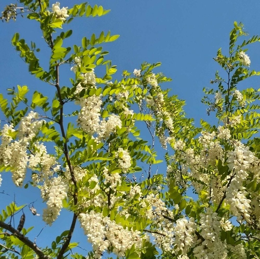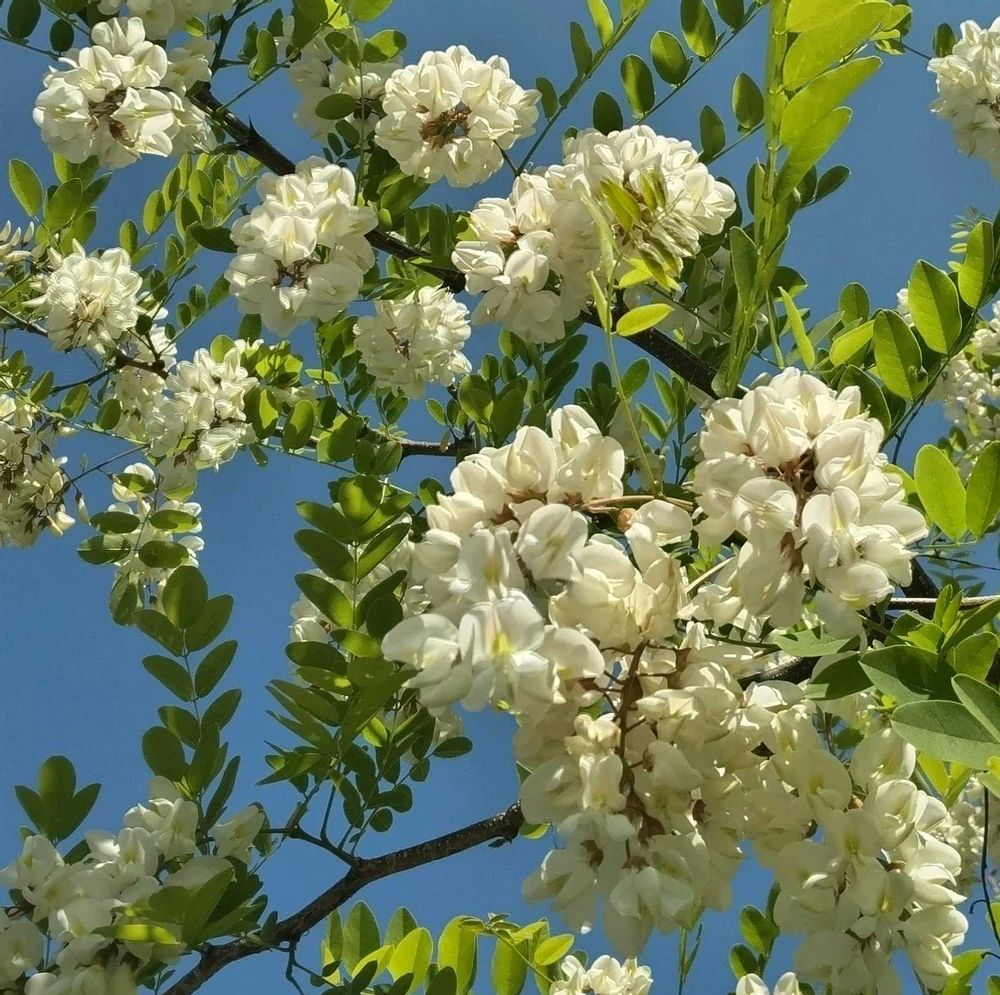 柵があるので近付けませんが、青空を背にニセアカシアの花が満開でした‼️