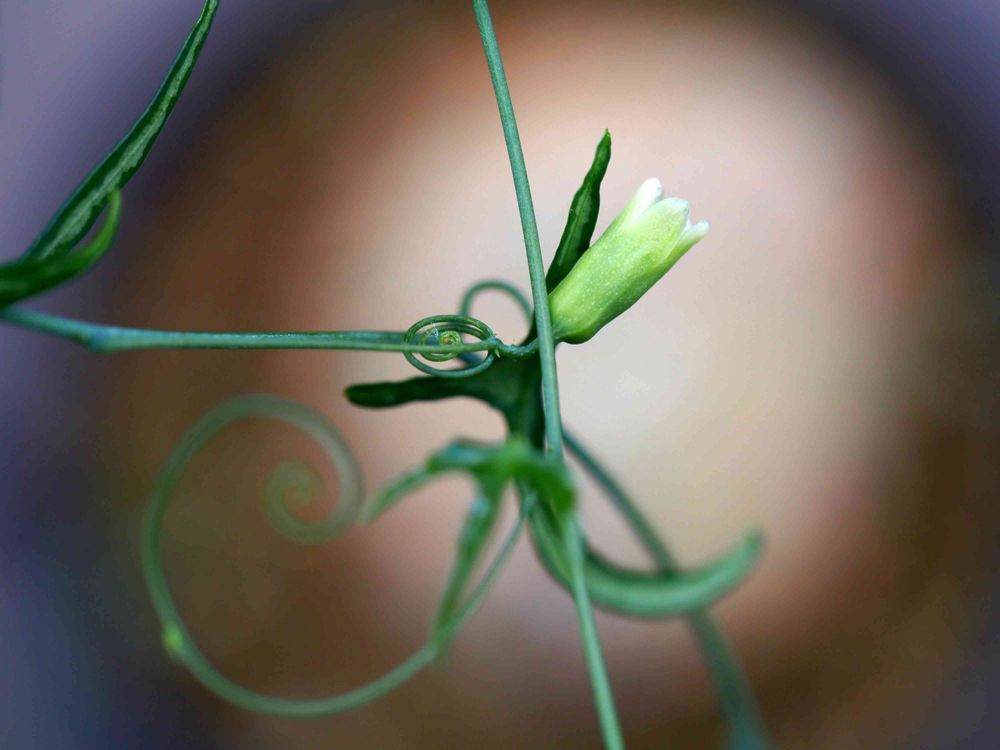 この植物はアフリカ原産のトケイソウ科の植物なんですよ。お芋のような塊根からツルが伸びてその途中にポツリポツリとお花が咲きます。
