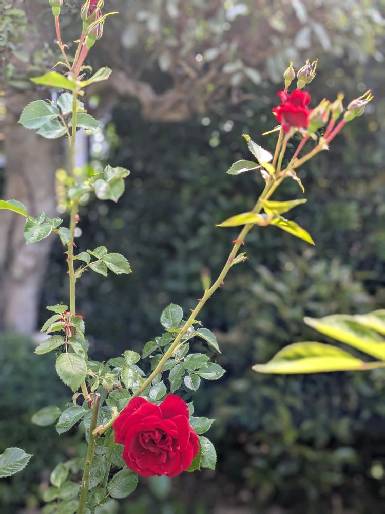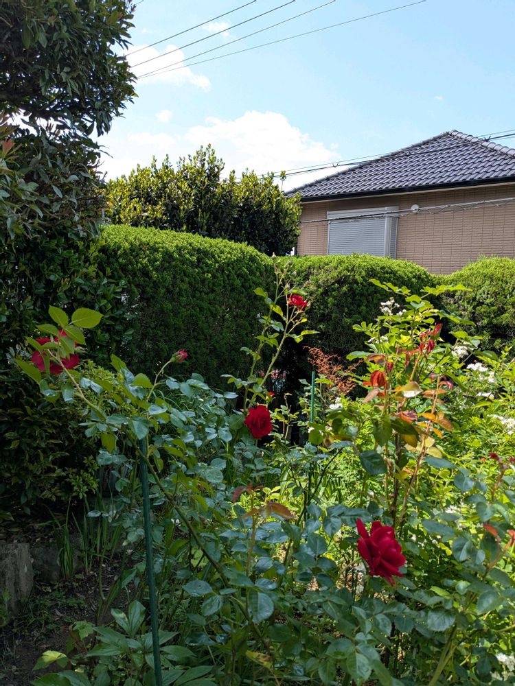 雨上がりの庭では深紅の🌹が鮮やかに青空に映え次々と咲いている!!