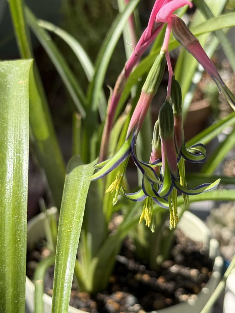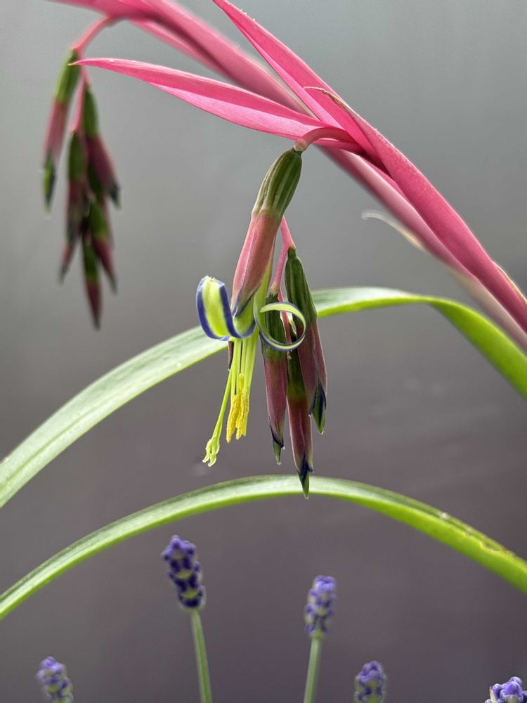 ヨウラクツツアナナス〜個性派ちゃんが咲きましたね〜クルンとした花弁が可愛い〜🤭💜💕💚