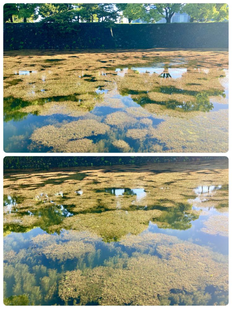 皇居凱旋濠の水草が水面に新芽を覗かせ、桜田濠越しに見える隼町界隈の景色が新鮮に映えていた。