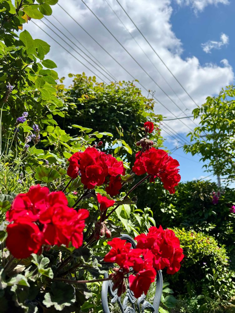 ②雨上がりは緑が眩しい❣️赤ゼラニウムとのコントラスト💙❤️🤍
