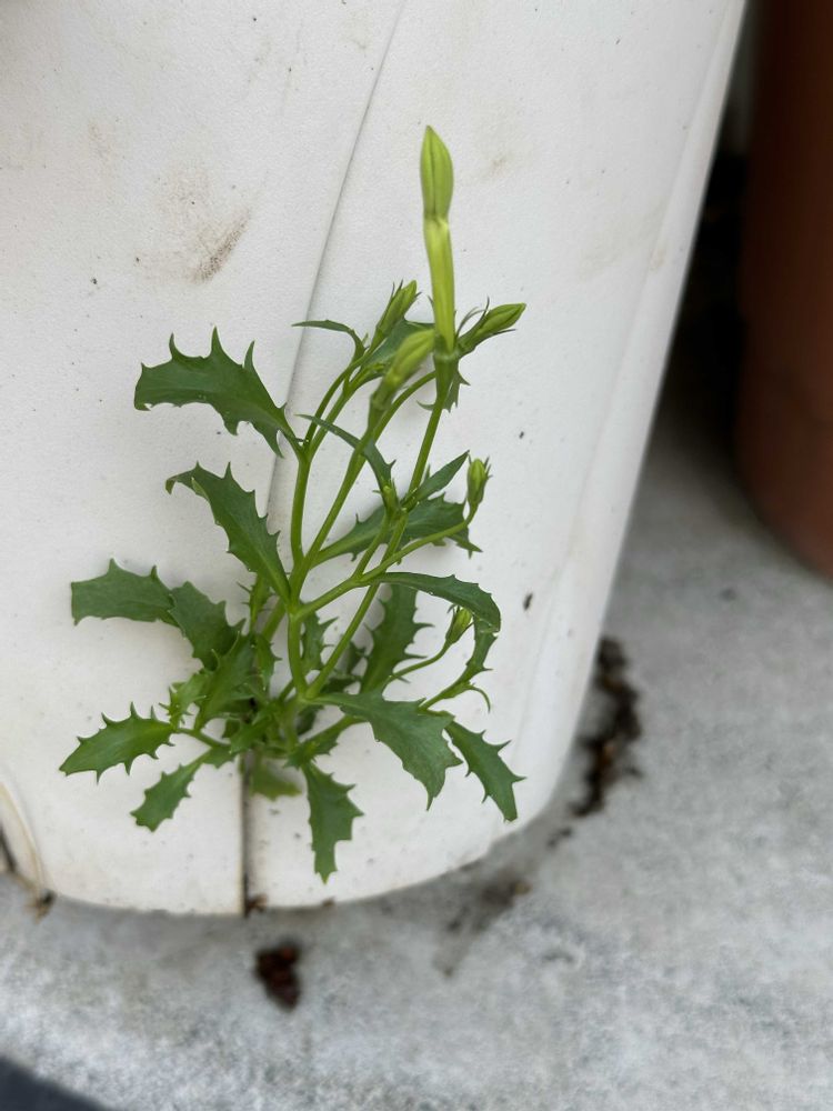 毎年零れ種で出てくるイソトマ。今年はこんな所から!地面から出てきてると思って鉢が邪魔してるのかと退けたら、なんとスリットの隙間からでした。