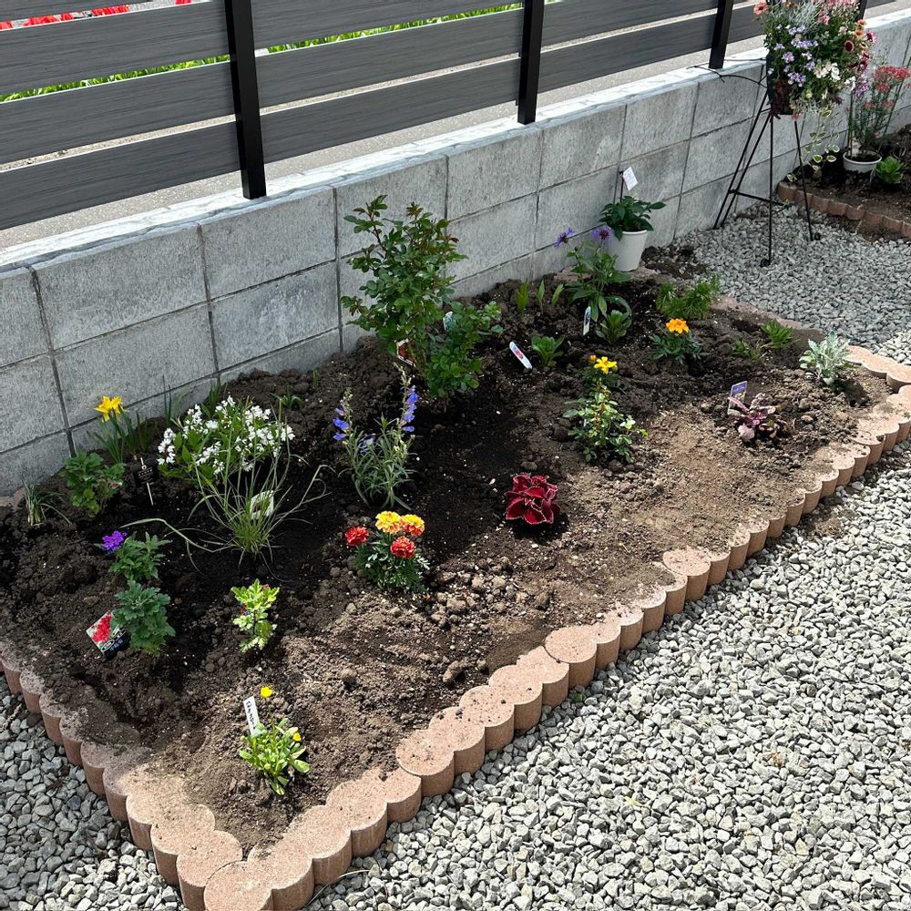 一枚目の花壇にはチャレンジでバラを植えました。全く暖地とはお世話サイクルが違うので、専門店でじっくり話を聞いて、寒くても強く育つバラをチョイス。本当はロサオリエンテスのシャルールを植えたかったけど、そこのお店曰くロサオリは、北海道の寒さだと難しいかも?ということでした。種類はたくさんあるから全部でないとは思いますが。まずはお店おすすめの苗をチョイス。