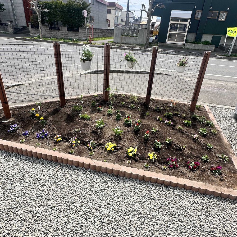 花壇と寄せ植えのプレゼント素敵💓です〜。庭から見える道路が🛣️札幌っぽいですね。道幅広くで広々と