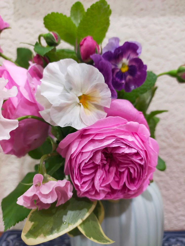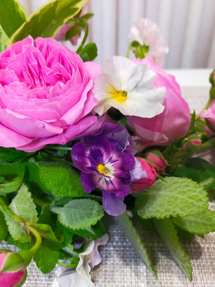 庭のルィーズオディエとパンジー、ツルニチニチソウ、アップルミントでブーケを作りました。お友達に🎁したら