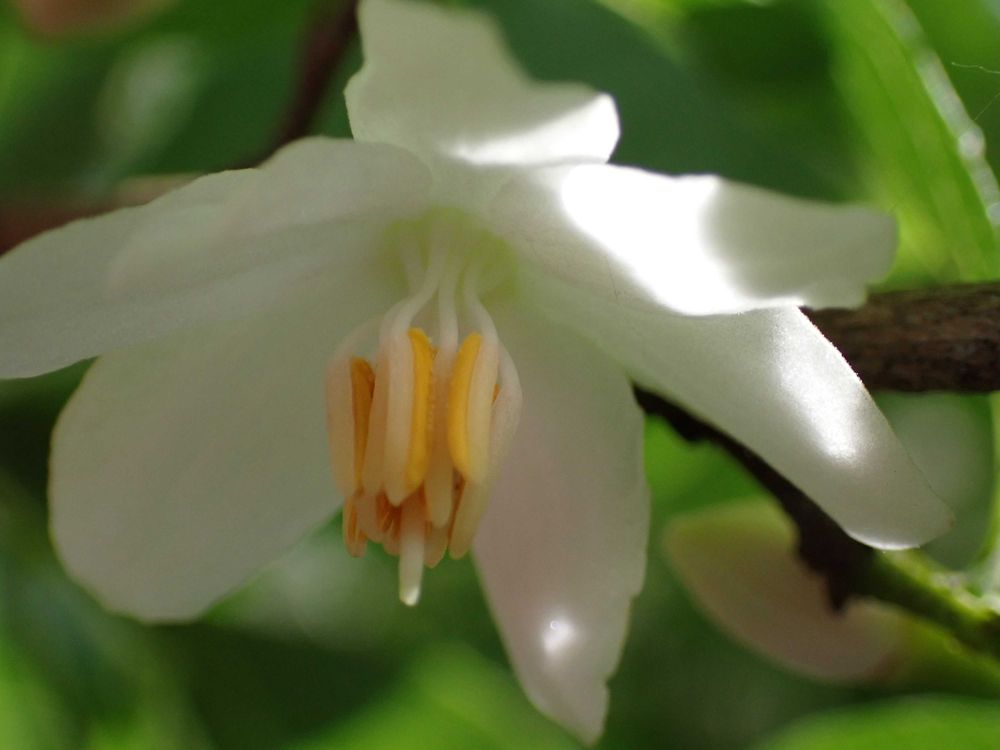 花は両性花です。花冠が深く5裂した白色の花を枝先に、垂れ下がるようにつけていました。(①②③)
