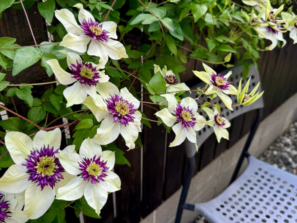 庭のセンター、板壁に沿って広がるクレマチス テッセン