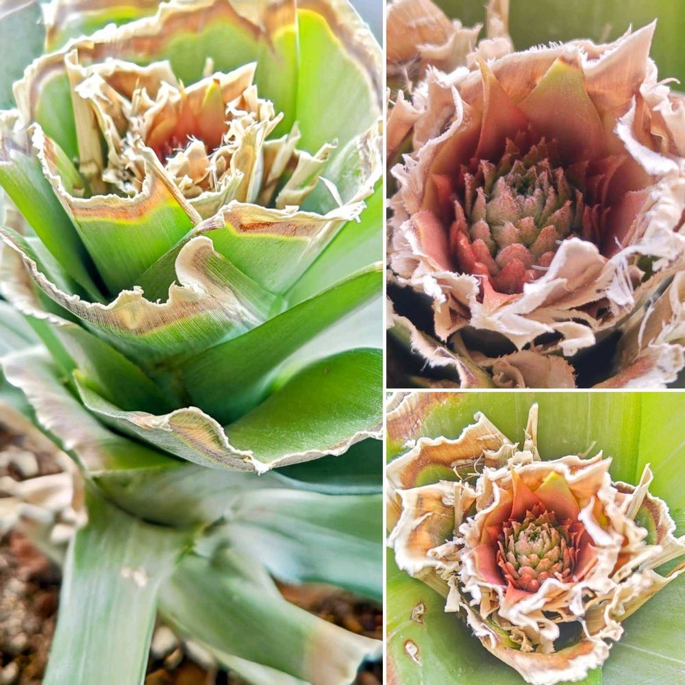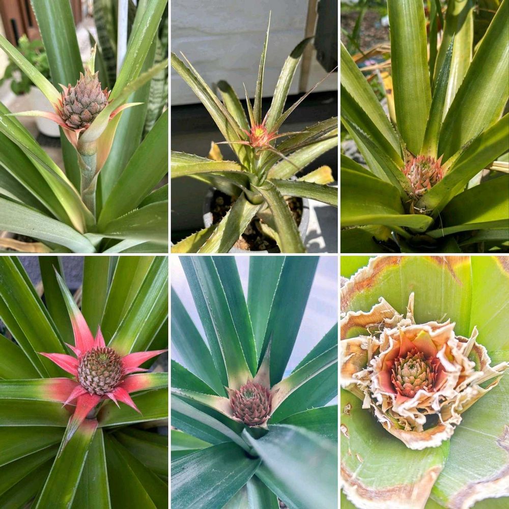 昨日、画像を園芸の先生に見ていただいて、花芽だと確認。パイナップル🍍は集合花。約150個の花が螺旋状に密集して付いてるそうです。花は下から順に咲き、花の色は紫色とのこと。
