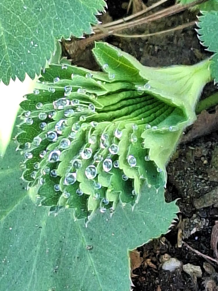 今朝、朝露を顔に一杯付けた、アルケミラモリスの赤ちゃん葉っぱを発見👀