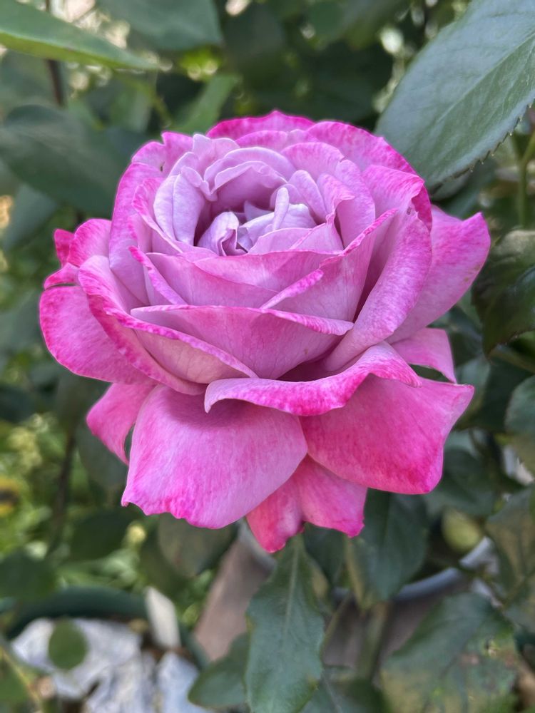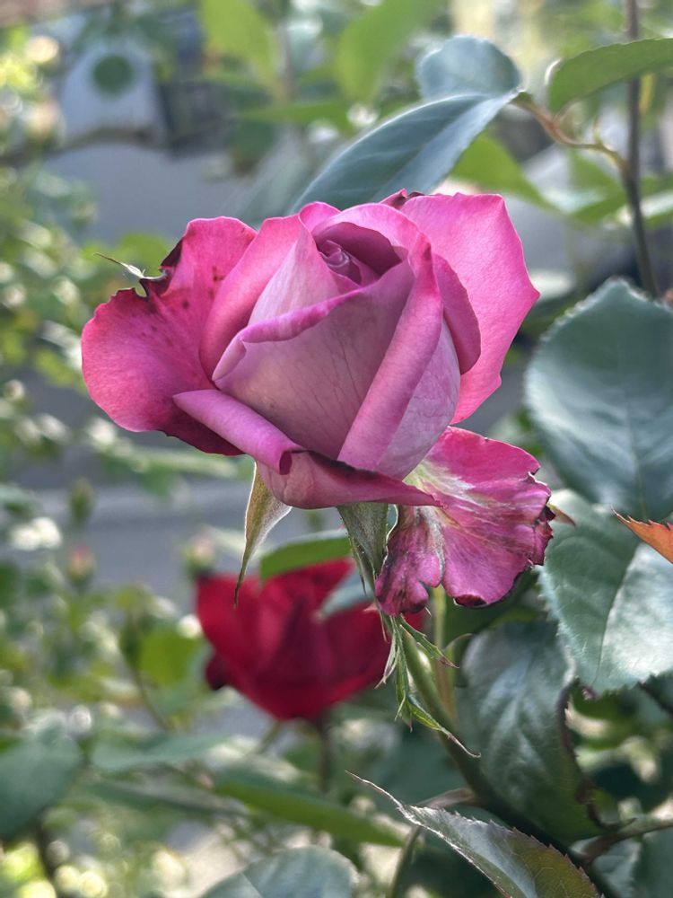 丸弁抱え咲きでブルーローズ系の強い香りがあり濃緑色の照葉、花弁の中心が濃いラベンダー色で、外側に向かうにつれ赤紫に染まり、多花性で花持ちもいい🌹