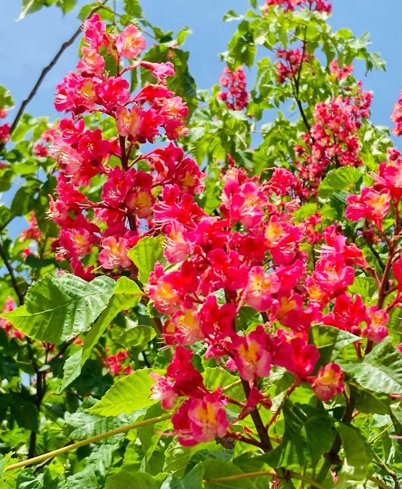 お散歩コースの街路樹に咲いていた、鮮やかな「紅花栃の木(ベニバナトチノキ)」でおはようございます🩷🍃🌳🍃🩷