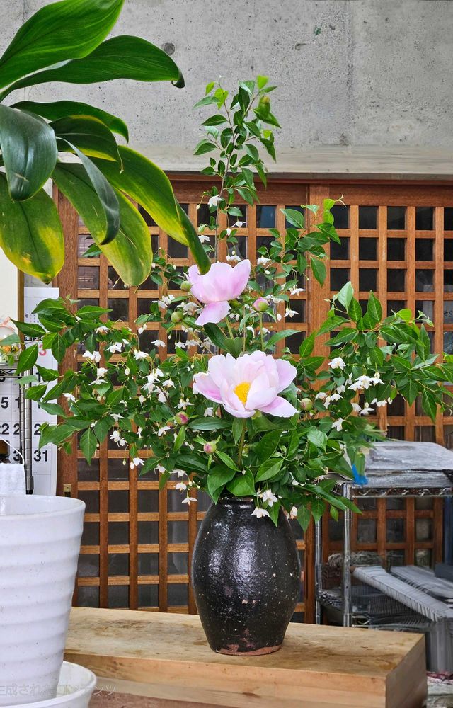 5️⃣芍薬とエゴノキの花が満開で~カワイイ~💕大好きなタコツボに挿して…♡♡