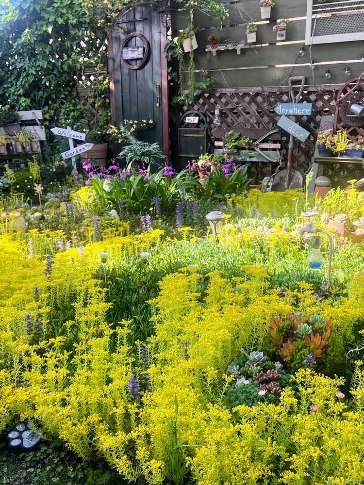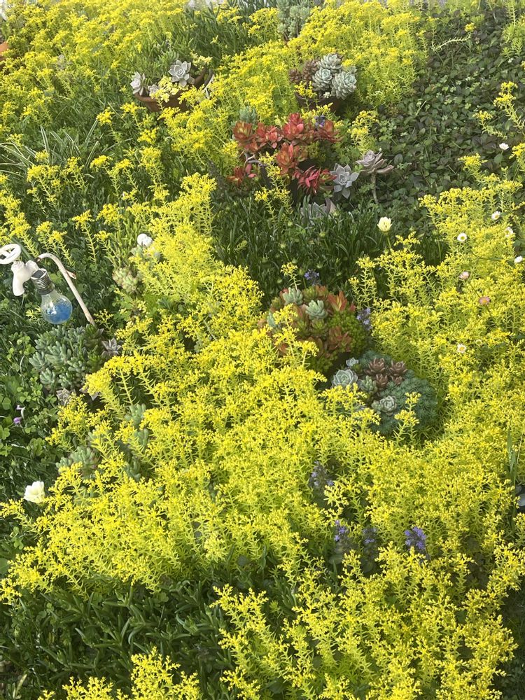 紫色のアジュガが咲き終わりセダム(マンネングサ)の逆襲がはじまりました😆