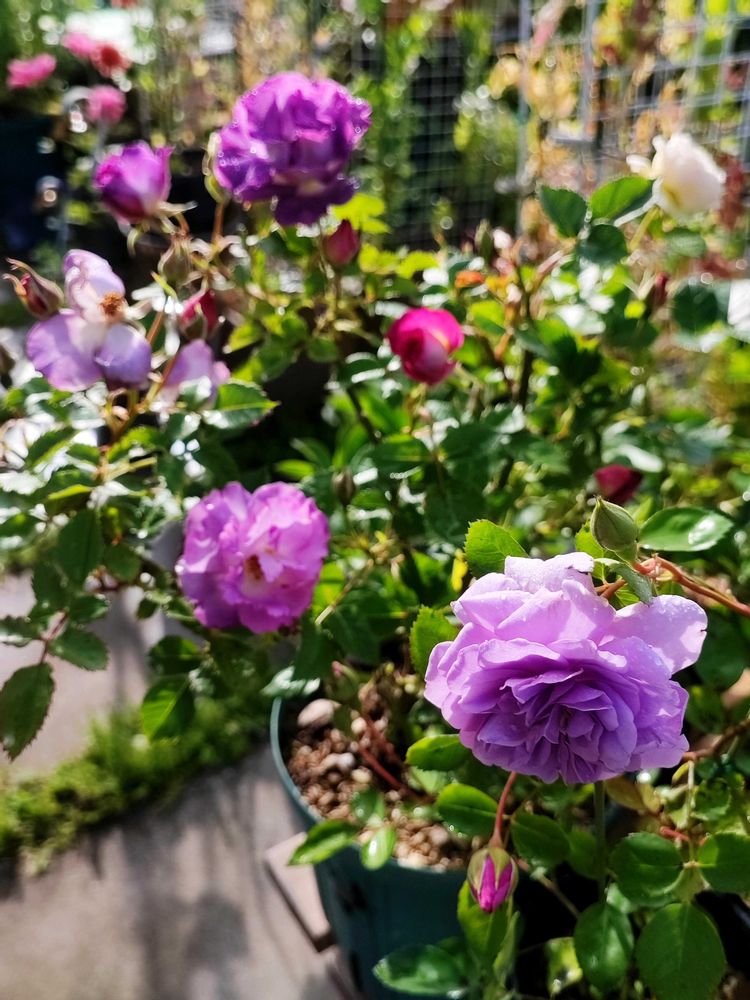本日のバラ。青系バラがよく咲いてます。手前がレイニーブルー、奥がブルーフォーユーです。まだどちらも2年目で小さいのですが、よく咲いてくれそうです。特にブルーフォーユーの方はたくさん咲く気満々みたいです。