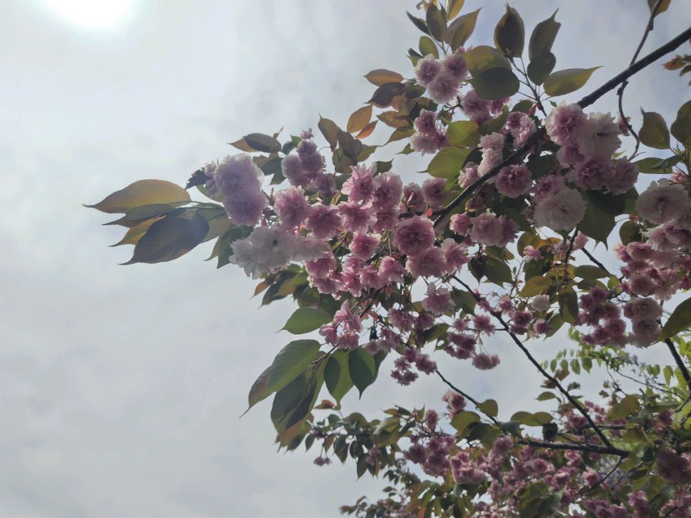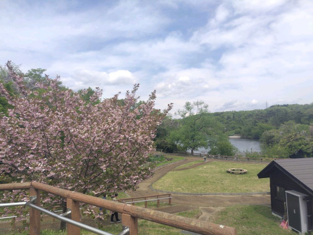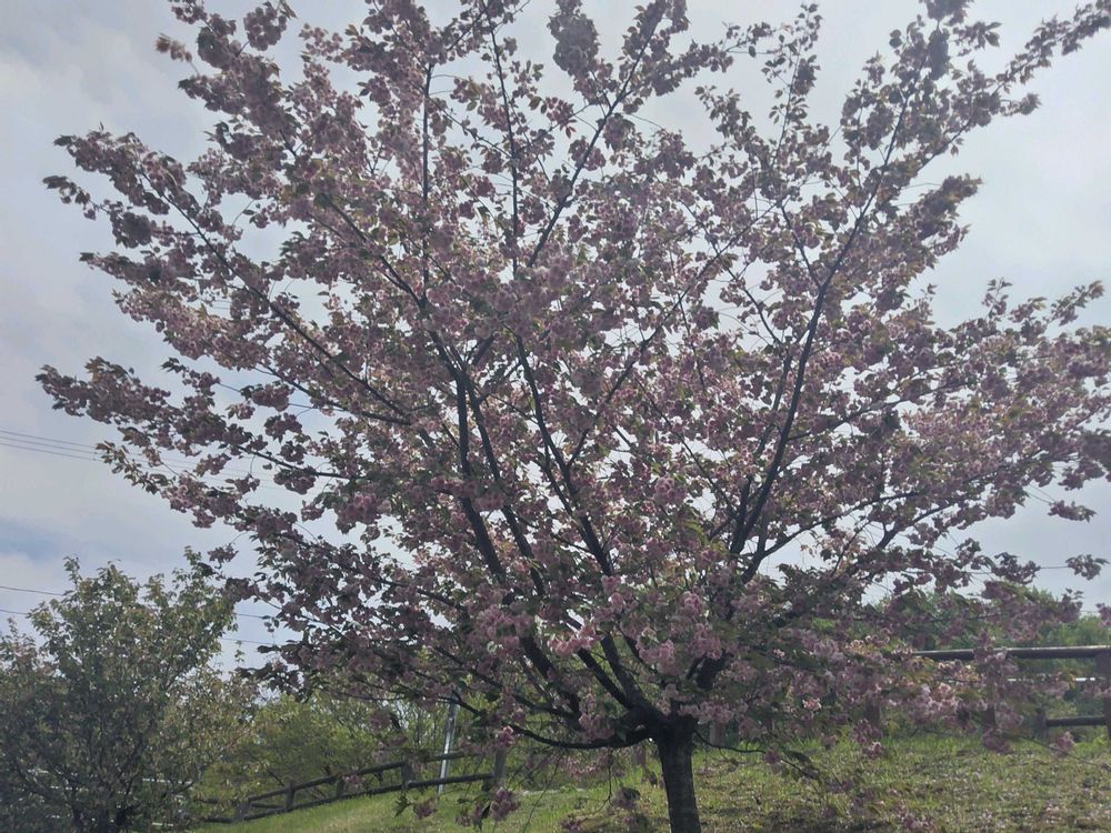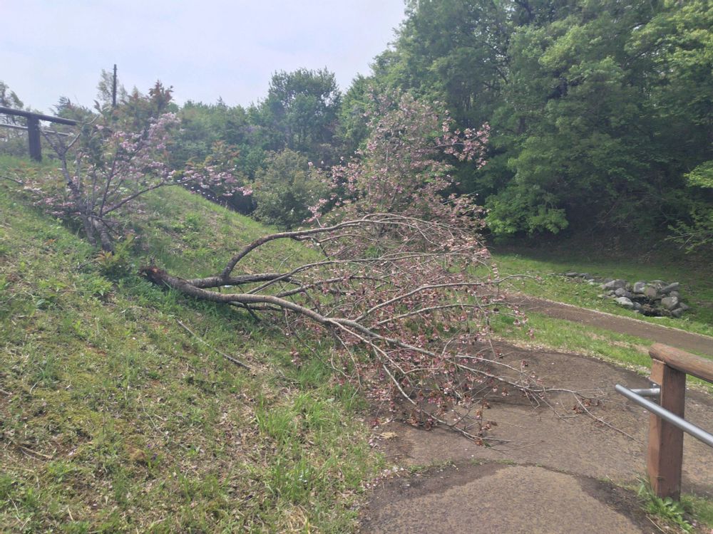 藤の花以外にも八重桜が咲いています。先日の強風の影響か、倒れた桜の木が有りました。