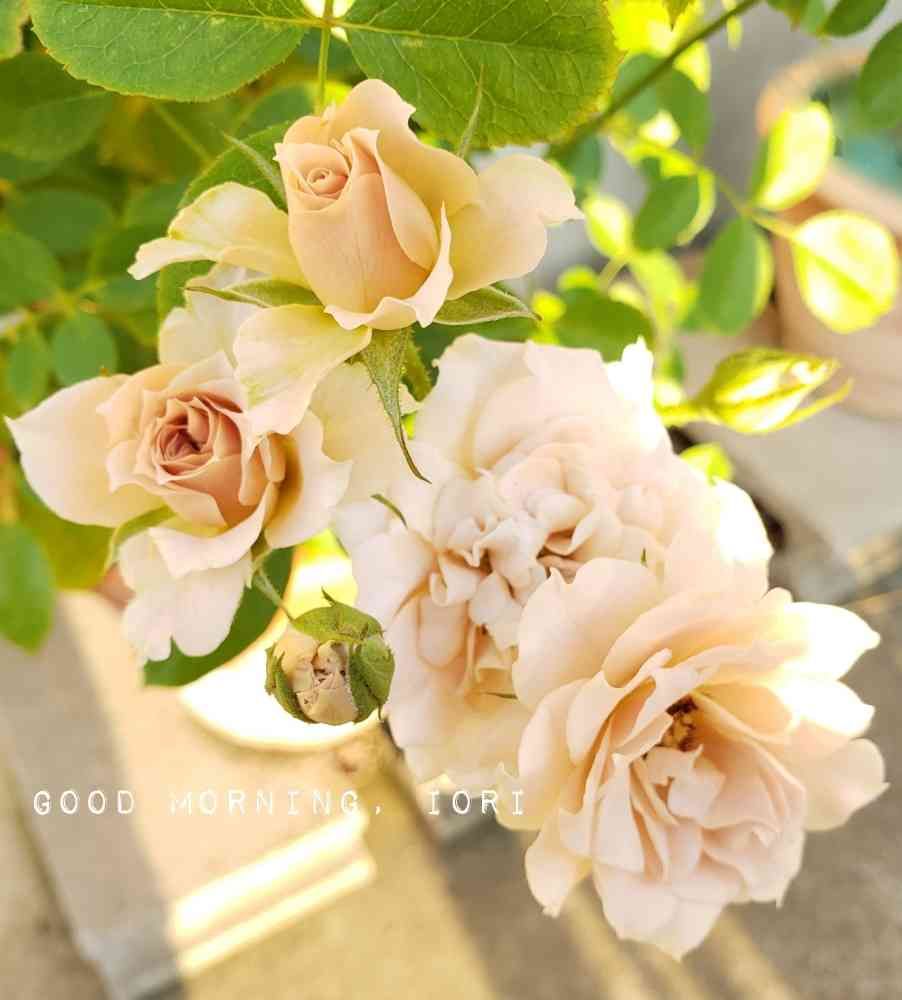 朝陽を浴びて咲いてます。左側の影は私の長い脚😁
