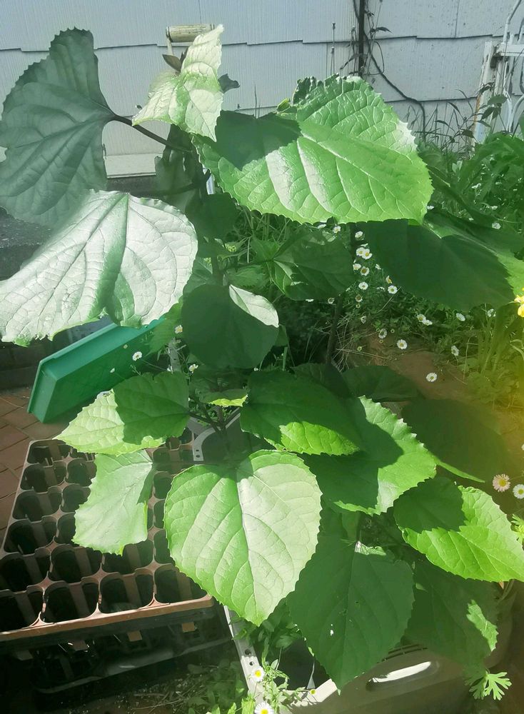 ほっておいたらずいぶんと元気になって、いつ花芽がつくのかと、楽しみにしていた。昨年は一つも花芽はつかず、でも職場の裏庭に、たくさんの新芽が地面からニョキッと出てきた。調べてみると、地下茎で増えるらしい🥶慌てて、いくつかを鉢に移しあとは引き抜いた。うちにあるノウゼンカズラのようなことにならなければいいのだけど、、、ちょっと冷や汗かいてます😂近所の人から「これなすの葉っぱ?」と言われるほど立派な葉っぱだけど花芽はなし。