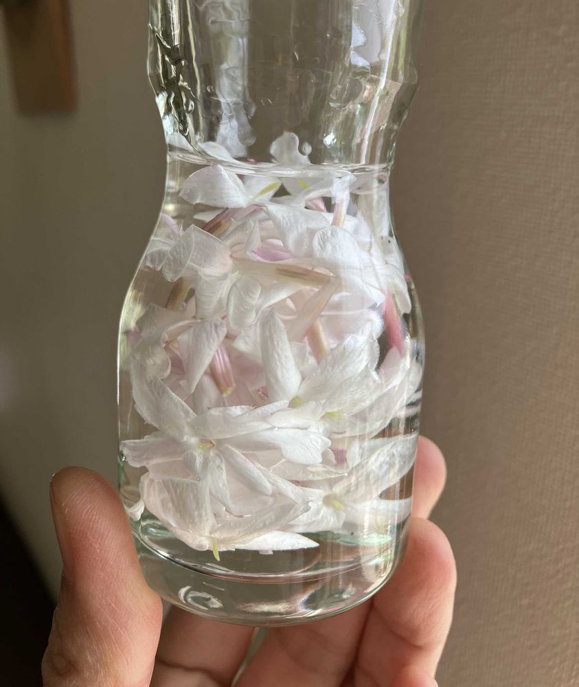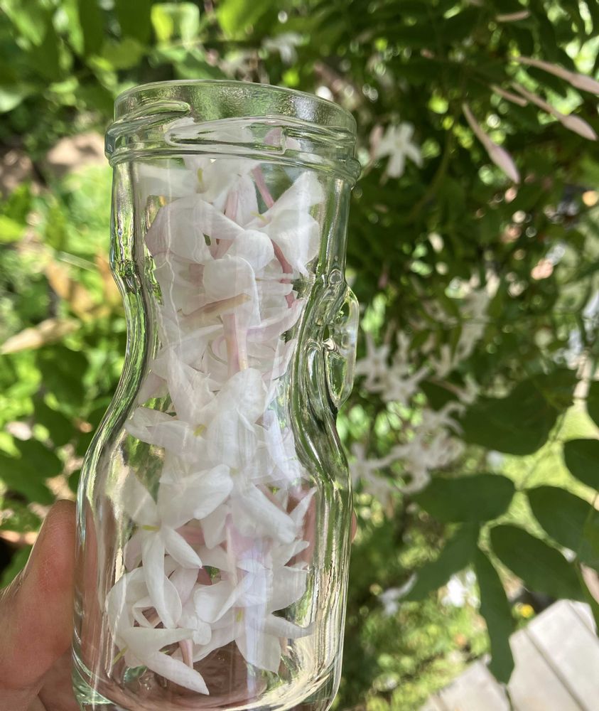 羽衣ジャスミンが沢山咲いたので、ジャスミンウォッカを作ります。ウォッカの中に開花直後の花を詰め込むとウォッカにジャスミンの香りが移ります( ˘͈ ᵕ ˘͈ )飲むわけじゃないけど、クンクンずっと香りを楽しめます〜