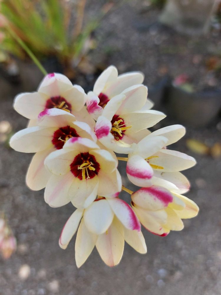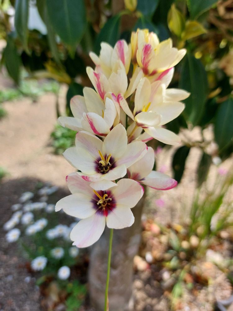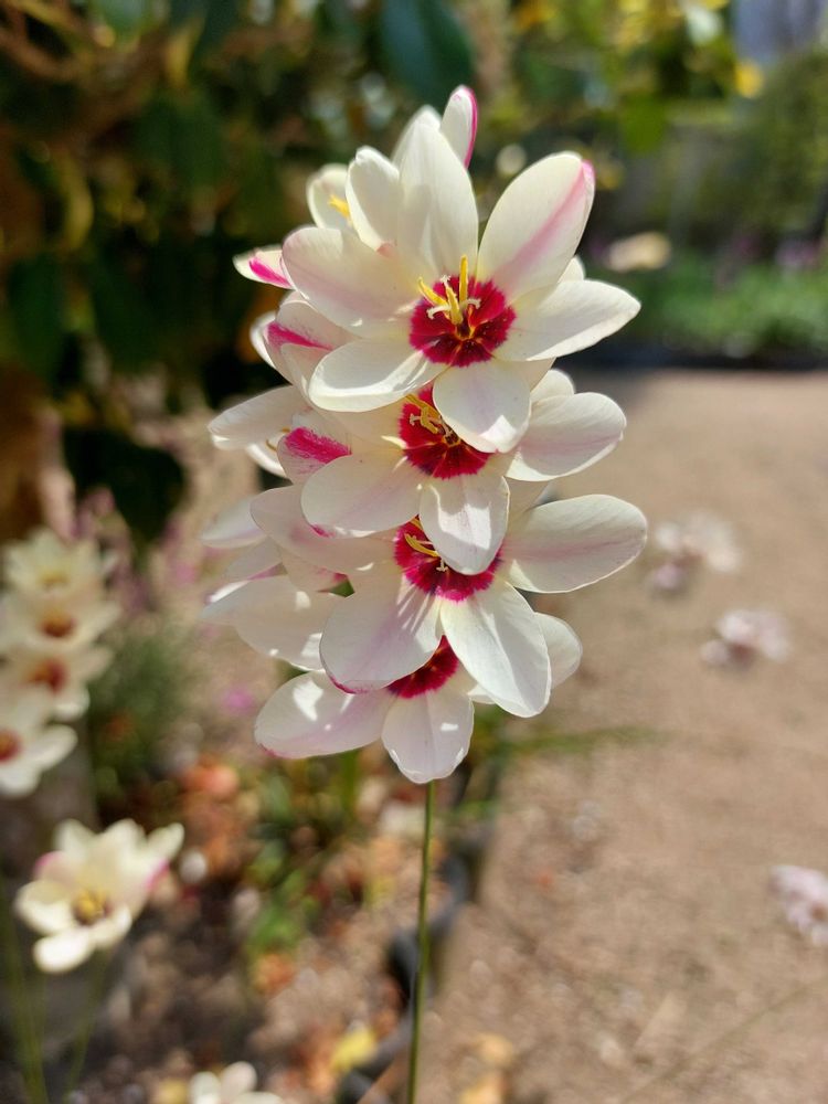 このお花、イキシアの仲間でしょうか?花のボリュームに対して、茎が細いので、風で揺れる感じなのかしら。