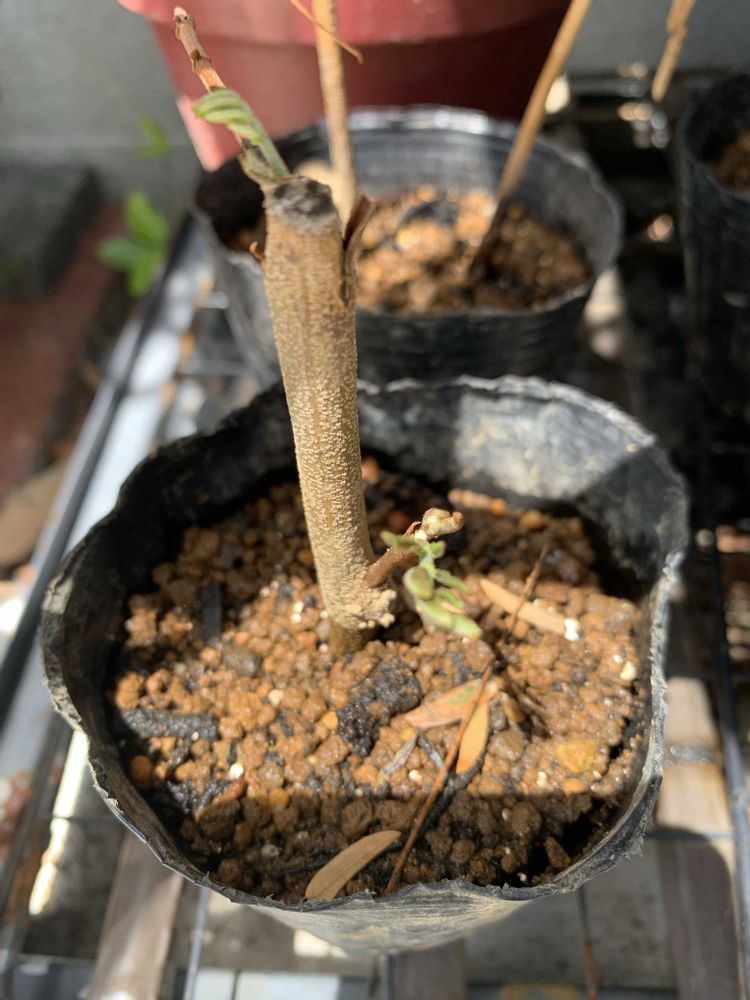 今回は、秋に赤玉に挿し木してサンルームで管理してたけど葉は枯れて「ただの棒」でしかなかったから、他の植物の植え替えで腐葉土と赤玉を混ぜた余ってる土に挿し木ておいたんです。