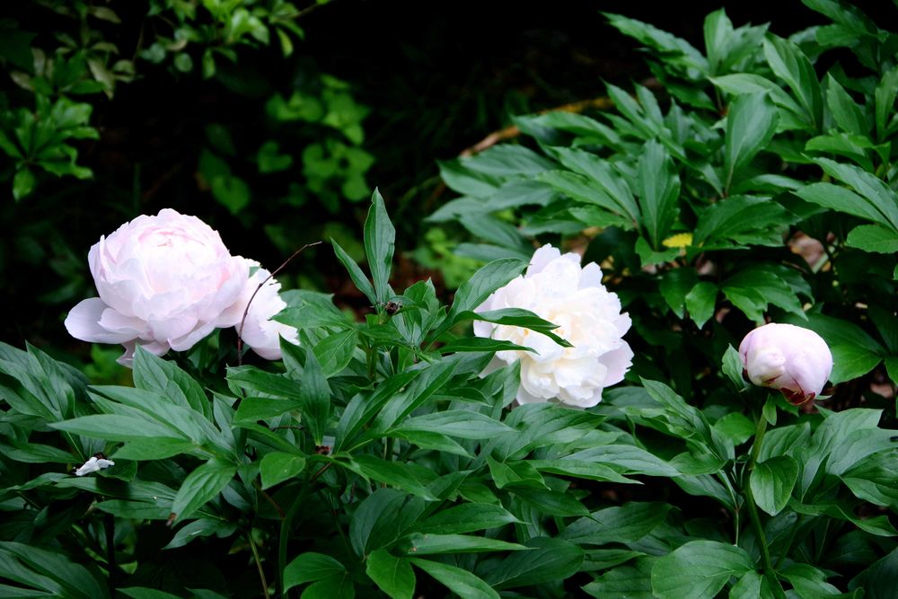 ボタン(牡丹)の花が咲ききって、花びらを地上に落とすと、新たにシャクヤク(芍薬)の、ふっくらして柔らかさの感じられる花が静かに開き始めました
